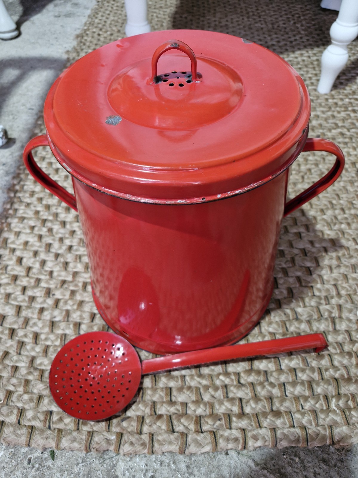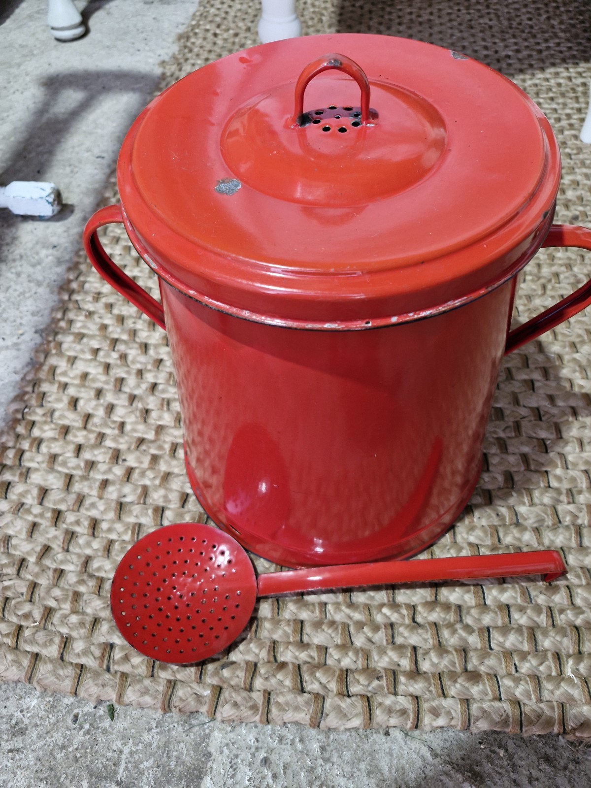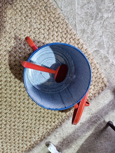 Vintage RETRO 1960s Hungarian red Enamel POT and Ladle.Bin / potato, veg store.
